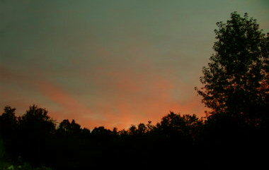 The early evening is a paint-by-numbers filled with impossible colors of aqua and coral that layer with streaks of clouds. She would have sat out on the back deck painting it, the colors settling into the canvas even as they blend into the horizon of trees. I would have come out with a shawl to protect her from the chill, stood there watching as the colors faded darkly into night.